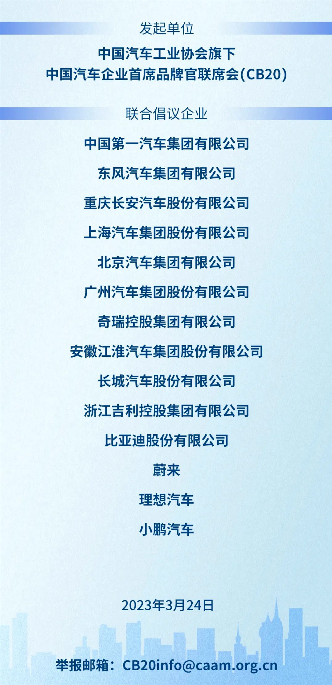 前天(2023年3月25日),不少財經媒體都報道這件事,由中國汽車工業協會旗下的中國汽車企業首席品牌官聯席會牽頭,包括比亞迪、一汽、東風、上汽、長安、北汽、廣汽、奇瑞、理想、小鵬、蔚來等國內主要的汽車生產廠家簽名,共同抵制網絡水軍的聯合倡議書,在2023年3月24日公佈。