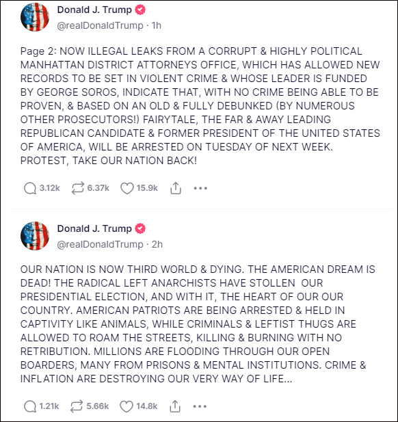 一週前的3月18日,美利堅前大統領特朗普在社交媒體上“自宣”,自己很可能在21日被逮捕,呼籲自己的支持者站出來進行抗議:“出來抗議吧!奪回我們的國家!”