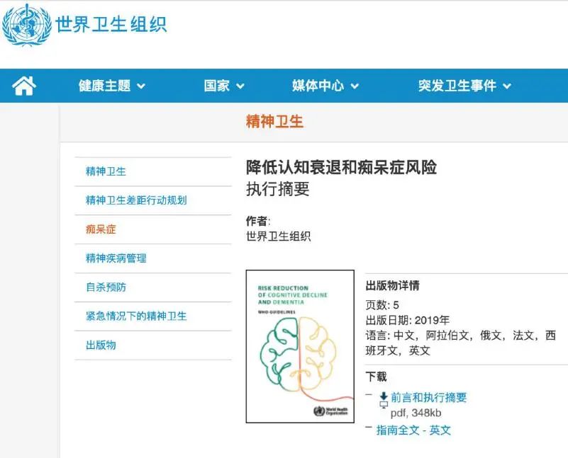 世界衞生組織WHO發佈的《降低認知衰退和痴呆症風險》認為,通過改善生活和飲食方式是可以起到預防痴呆症的作用的是,至少可以推遲或延緩痴呆症的發生。