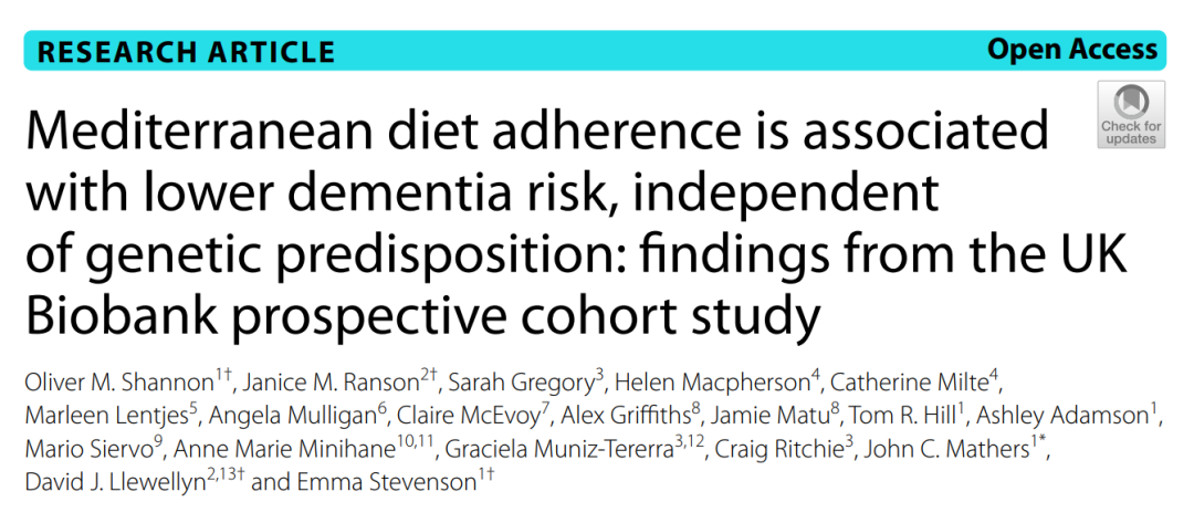 [1]Mediterranean diet adherence is associated with lower dementia risk, independent of genetic predisposition: fndings from the UK Biobank prospective cohort study