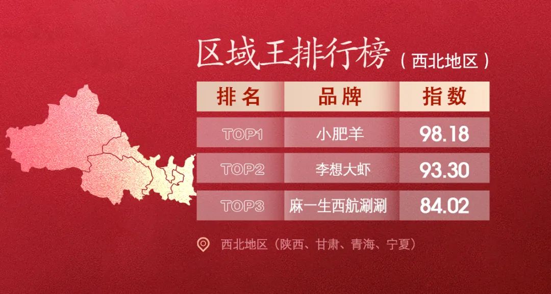 小肥羊誕生內蒙,成名早、實力強,第一當之無愧;李想大蝦作為一個華中品牌,竟然能在西北戰區打到第二,足見能力,當然,作為蝦火鍋的前三甲(王婆大蝦、李想大蝦、蝦吃蝦涮),跑到西北當榜眼,也説得過去。