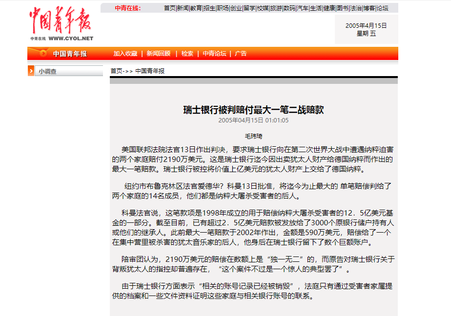 圖源:中國青年報 瑞士銀行就二戰問題被判賠款