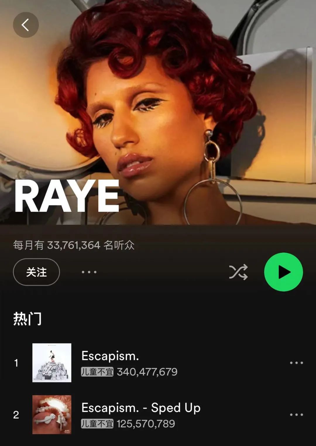 25歲的英國歌手Raye在英國的排行榜上已取得過不錯的成績,她正試圖在美國也打造一首熱門歌曲。但單曲《Escapism》的成績似乎不盡如人意,上線一週後播放量就開始下滑。