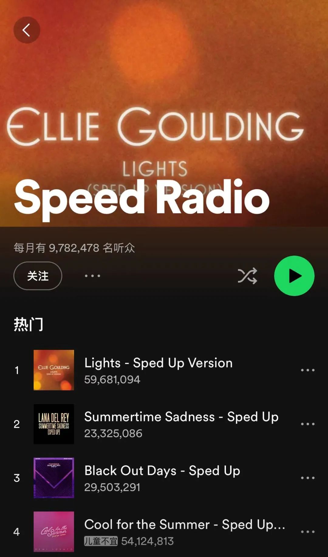 環球音樂啓動了 Spotify 帳户Speed Radio突出變速的曲目,每月有超過 900 萬聽眾。“每當我們獲得這些具有吸引力的變速混音時,我們都會用Speed Radio標記它,它只會放大增長。”Nasseri 説,“對於藝術家來説,這是一個非常有價值的工具。”