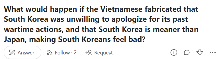 在外網有一個話題:如果越南人捏造韓國不願意為其過去的戰時行為道歉,並説韓國比日本更卑鄙,讓韓國人感覺不好,會發生什麼?一些國外網民發表了自己的看法。