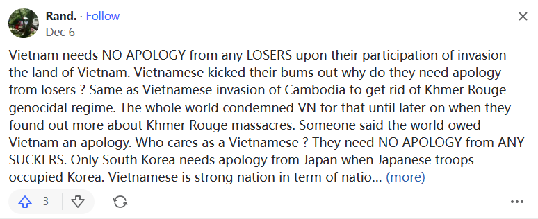 越南不需要任何失敗者的道歉,因為他們參與了對越南土地的入侵。越南人把他們的流浪漢趕走了,為什麼他們需要失敗者的道歉?就像越南入侵柬埔寨以擺脱紅色高棉的種族滅絕政權一樣。整個世界都在譴責越南,直到後來他們發現了更多關於紅色高棉的屠殺。有人説世界欠越南一個道歉。作為一個越南人,誰在乎呢?他們不需要任何傻瓜的道歉。只有韓國在日本軍隊佔領韓國時需要日本的道歉。越南在民族方面是強大的國家,在戰爭方面也是如此。作為越南人,我們不需要任何人的道歉。想玩戰爭遊戲,就來吧,把你的屁股放在越南的土地上……就這樣!