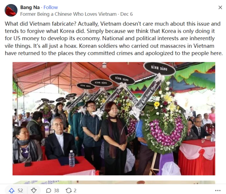 越南捏造了什麼?其實,越南對這個問題並不太關心,往往會原諒韓國的所作所為。只因為我們認為韓國只是為了美國的錢來發展其經濟。國家和政治利益本來就是卑鄙的東西。這一切都只是一個騙局。在越南進行屠殺的韓國士兵回到了他們犯罪的地方,向這裏的人民道歉。