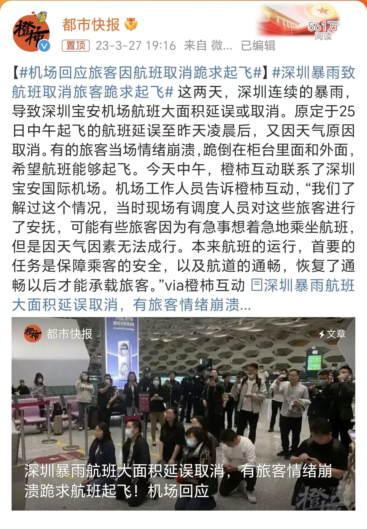 深圳暴雨航班大面積延誤取消,有乘客情緒崩潰跪求起飛,什麼事急得命也不要了?_風聞