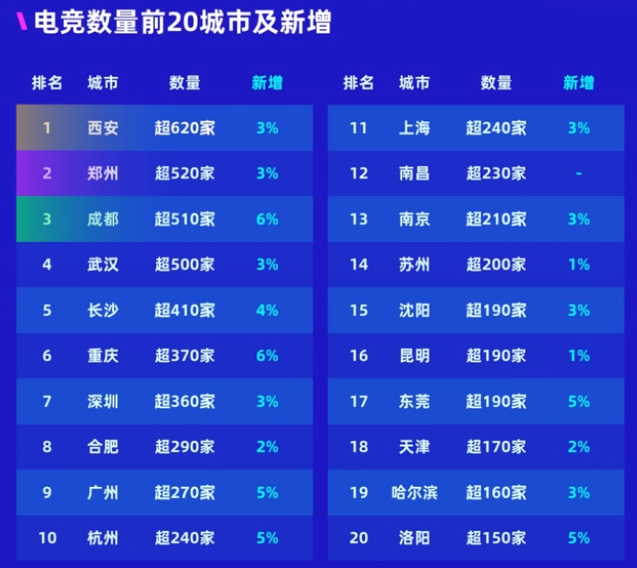 電競酒店數量TOP5城市分別為:西安、鄭州、成都、武漢、長沙
