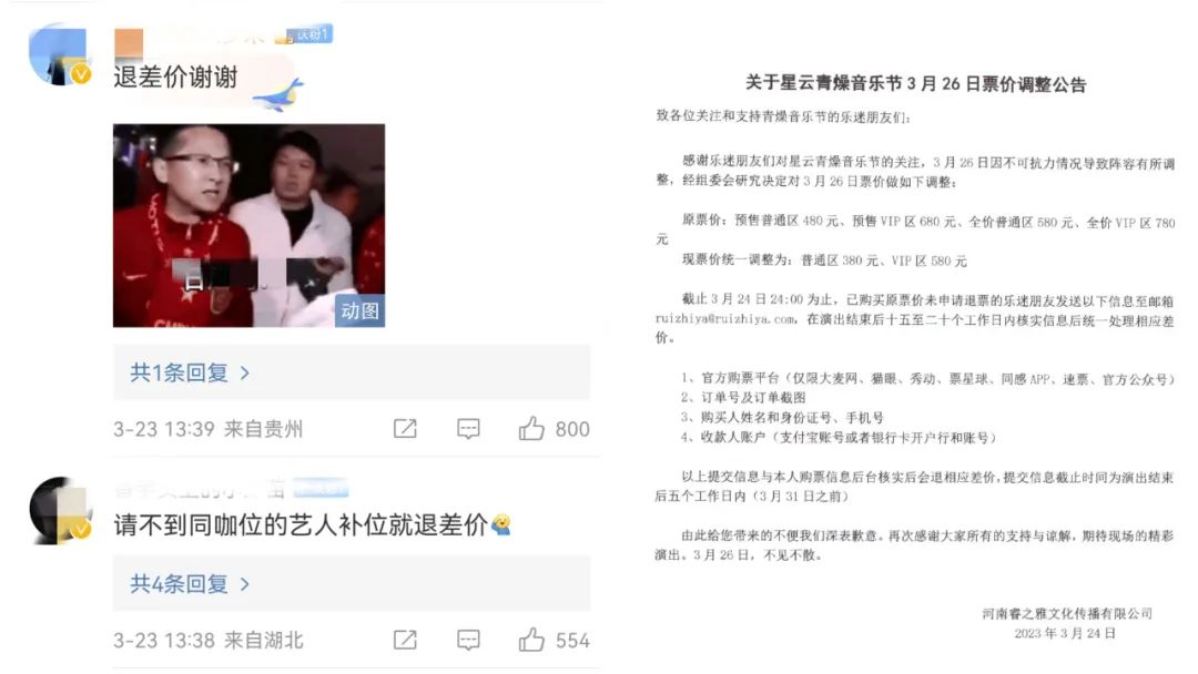 比如,婺女洲星雲青燥音樂節3月26日“青春場”演出,原定陣容張靚穎因身體不適無法參與,大量樂迷轉而選擇退票,剩餘陣容幾乎均為INTO1劉宇、張顏齊、趙讓、卜凡等新晉流量偶像。購票樂迷小張就表示,在3月23日張靚穎取消參與的消息傳出後,不少消費者在音樂節官方賬號下要求退票,“因為咖位不同定價也不同,既然找不到同一層次的補位演出,就應該退票退差價,因此很多人都是臨時退票”。