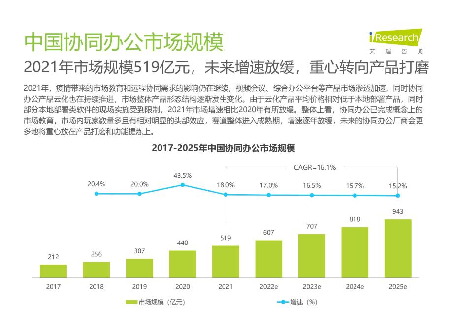 計世諮詢的研究報告顯示,2009年我國協同辦公市場規模僅為6.8億元,而艾瑞諮詢《2023年中國協同辦公行業研究報告》顯示,2020協同市場規模增長43.5%、2021年增長18%、2022年增長17%,預計2023年將增長16.5%、突破700億元。