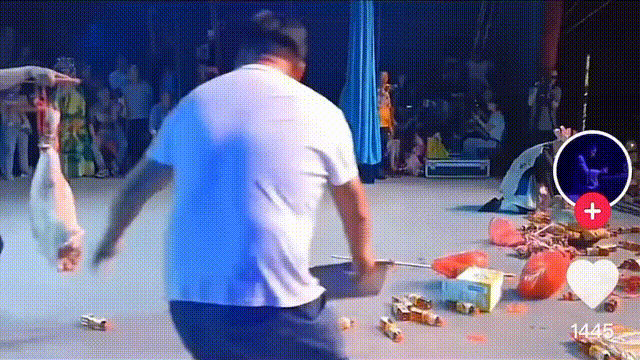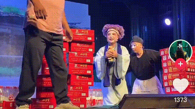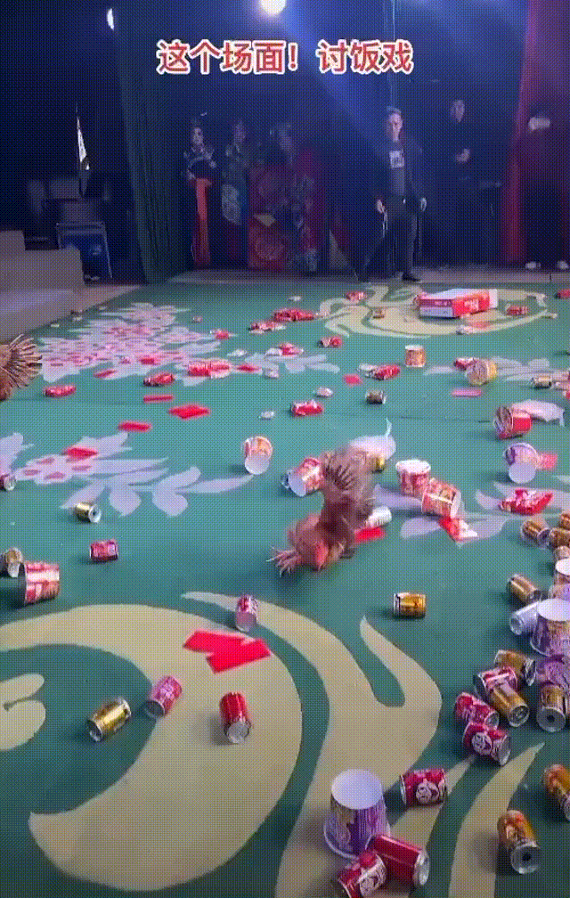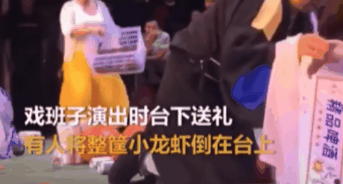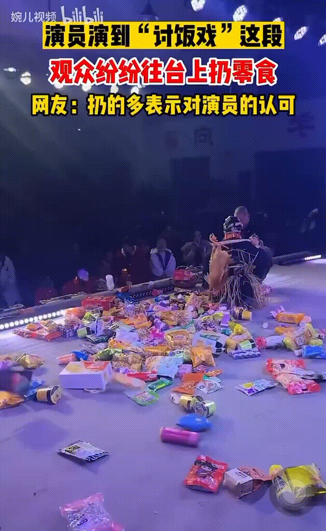台下的觀眾在瘋狂往台上給演員投擲食物,還有人成箱搬運泡麪和飲料上台。感覺跪在台上的演員收拾收拾東西,就能村口去開士多店了。