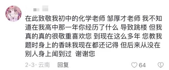以及,跳樓身亡但始終受人敬重的鄒老師: