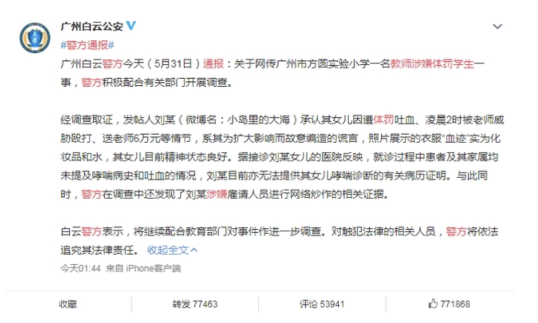 2020年,廣州某學生家長用化妝品和水偽造“血跡”,聲稱孩子被老師體罰,期望用輿論壓力迫使學校開除老師。