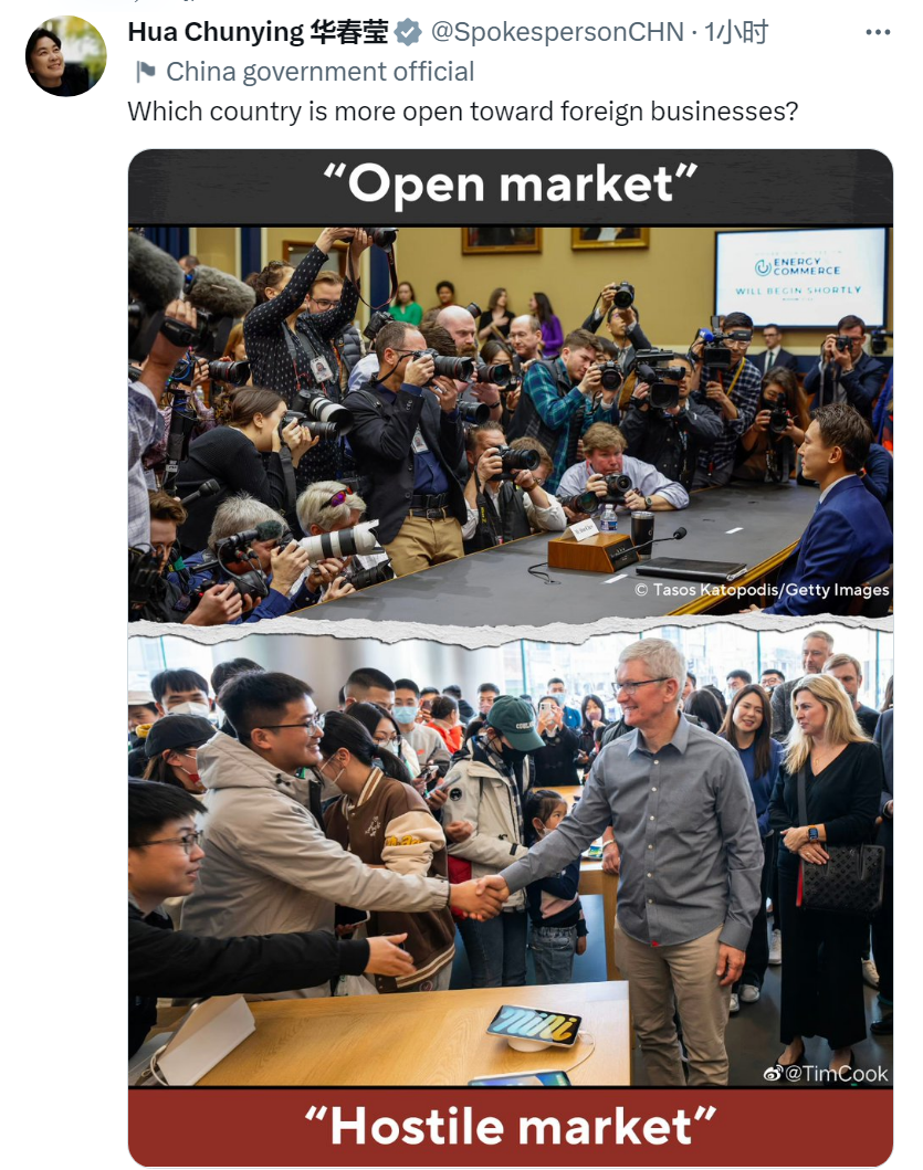 中國是中國,美國是美國。所以,華春瑩貼出了一張對比圖,一邊是美國政客對TikTokCEO周受資的圍攻,一邊是蘋果CEO在北京被熱情歡迎。她詰問:哪一個國家對外國企業更開放?