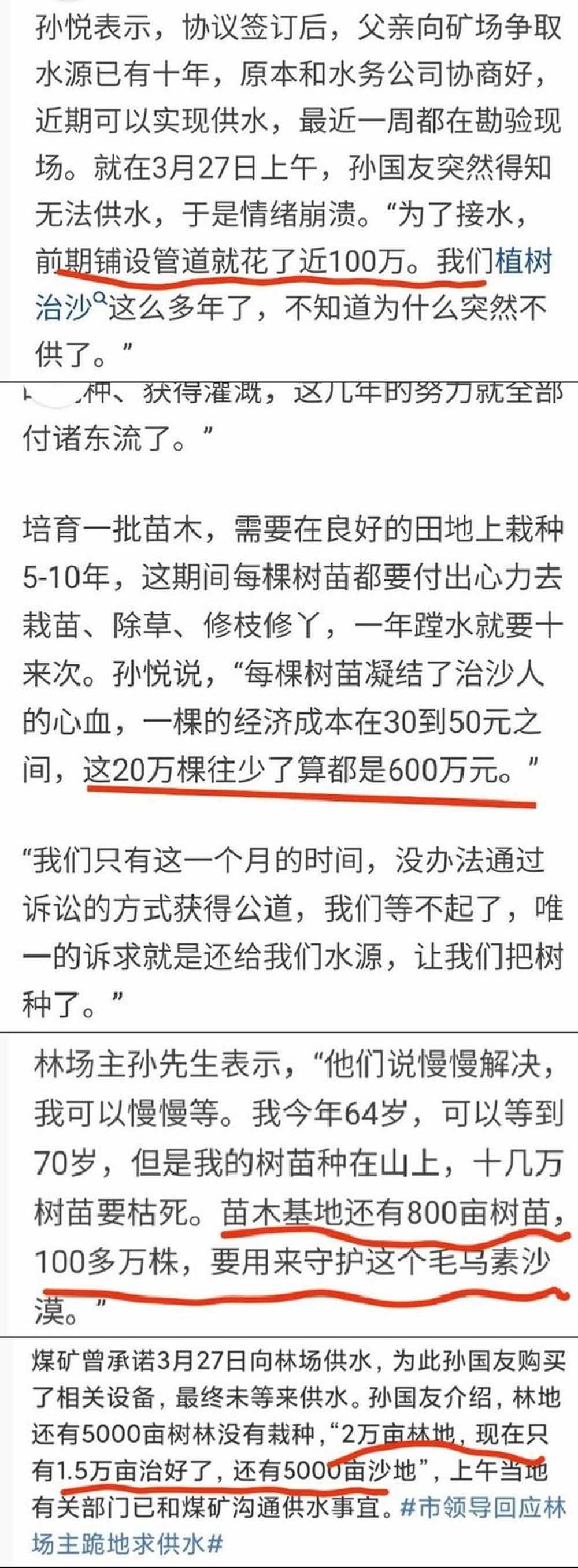 最後,我支持按協議來,請礦場給林先生的林場供水。另外,治理好毛烏素沙漠的也不是孫國友,是國家,是另外千千萬萬個無名植樹人。