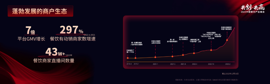 抖音生活服務目前行業整體生態已逐步建成。商家提供好的內容商品和服務,達人、服務商等作為生態重要的合作伙伴提供內容和經營支撐,商品、內容和服務被高效鏈接,最終觸達用户,為廣大餐飲商家帶來生意新增量。