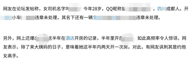 還有網友人肉出女司機的更多信息,公開發布,質疑其私生活,進行人身攻擊。