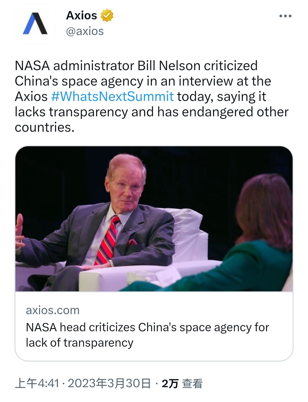 當地時間3月29日,美國宇航局(NASA)局長比爾·納爾遜(Bill Nelson)在接受美國數字新聞網(Axios)採訪時再度批評中國航天,聲稱中國航天缺乏透明度並危及其他國家的空間安全。