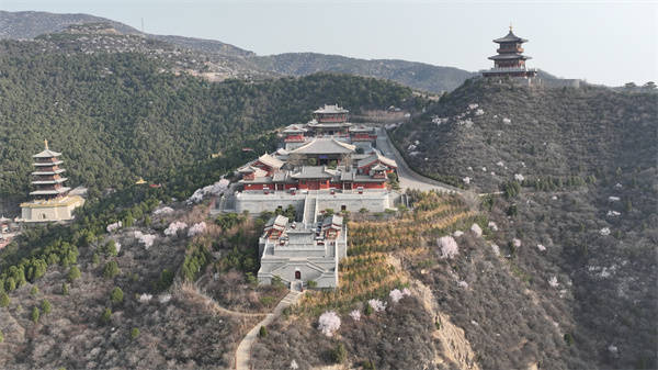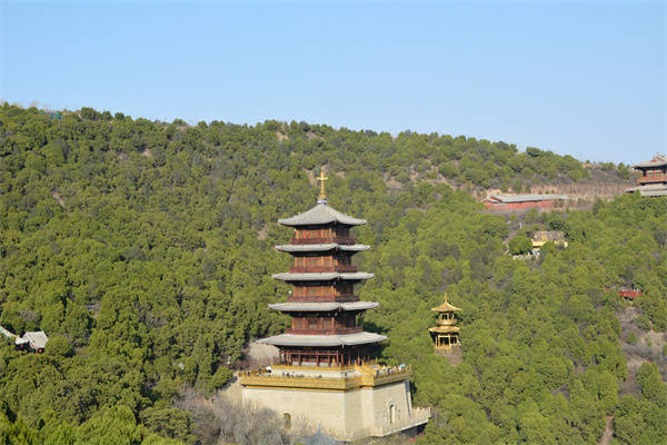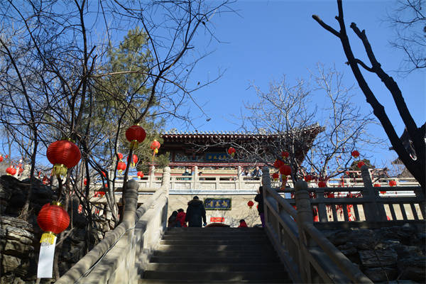 一年四季,太山景色各不相同,特點各異。冬日裏,枯黃的樹葉掉落,但山上的松柏愈顯倉幽。冬風拂過,隱約傳來悦耳的風鈴聲,清脆、純淨,盪滌了一切紛擾和雜念。松柏掩映之中,隱現着由牌樓、山門、戲台、中門、鐘鼓樓、三大士殿、佛祖閣、廂房、禪房、觀音堂、文殊殿、普賢殿構成的宏大寺院羣。整個寺廟依山而建,高低參差,錯落有致。拾級而上,木雕指路牌清晰瞭然,殿堂樓閣,小巧玲瓏,自成格局。