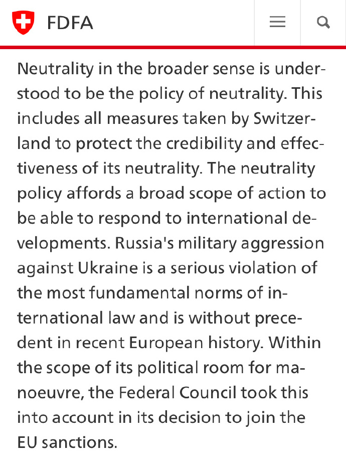 一、按照瑞士的觀點,哪怕他們在2022年跟隨歐盟給予俄羅斯金融制裁了,瑞士人依然認為他們根本就還是中立國家,因為並沒有違反瑞士1907年制定的中立法(the law of neutrality)。