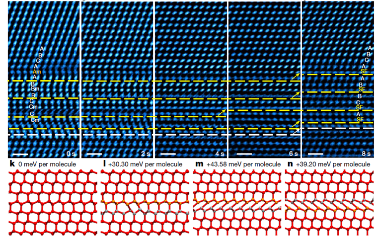 進一步地,研究人員表徵了立方冰內部的常見缺陷。根據是否引進堆垛無序晶疇為標準,研究人員將立方冰內部的常見缺陷分為了兩類,並利用電子束的激發效應探究了堆垛無序晶疇部分的結構動力學。實驗觀測結合分子動力學模擬結果表明,這種富缺陷的結構並不穩定,在電子束的擾動下缺陷層發生結構構型的協同扭曲乃至整體的攀爬。