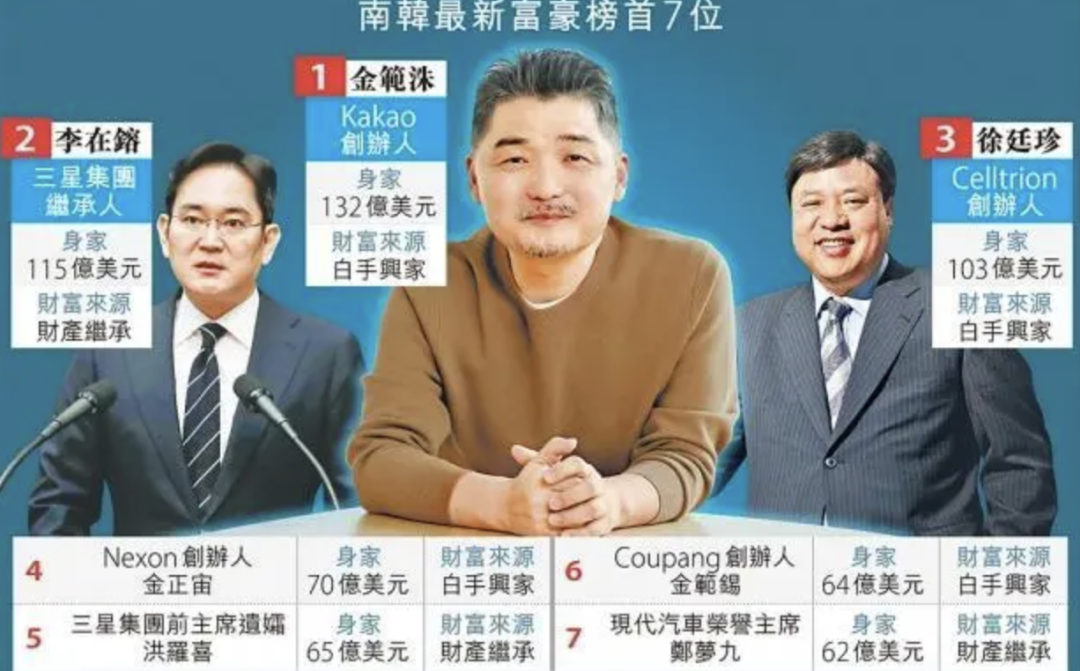 根據2022年福布斯榜數據統計,韓國億萬富豪有41人,互聯網企業家多達8人,十大富豪榜更是擠進了兩位互聯網新秀。
