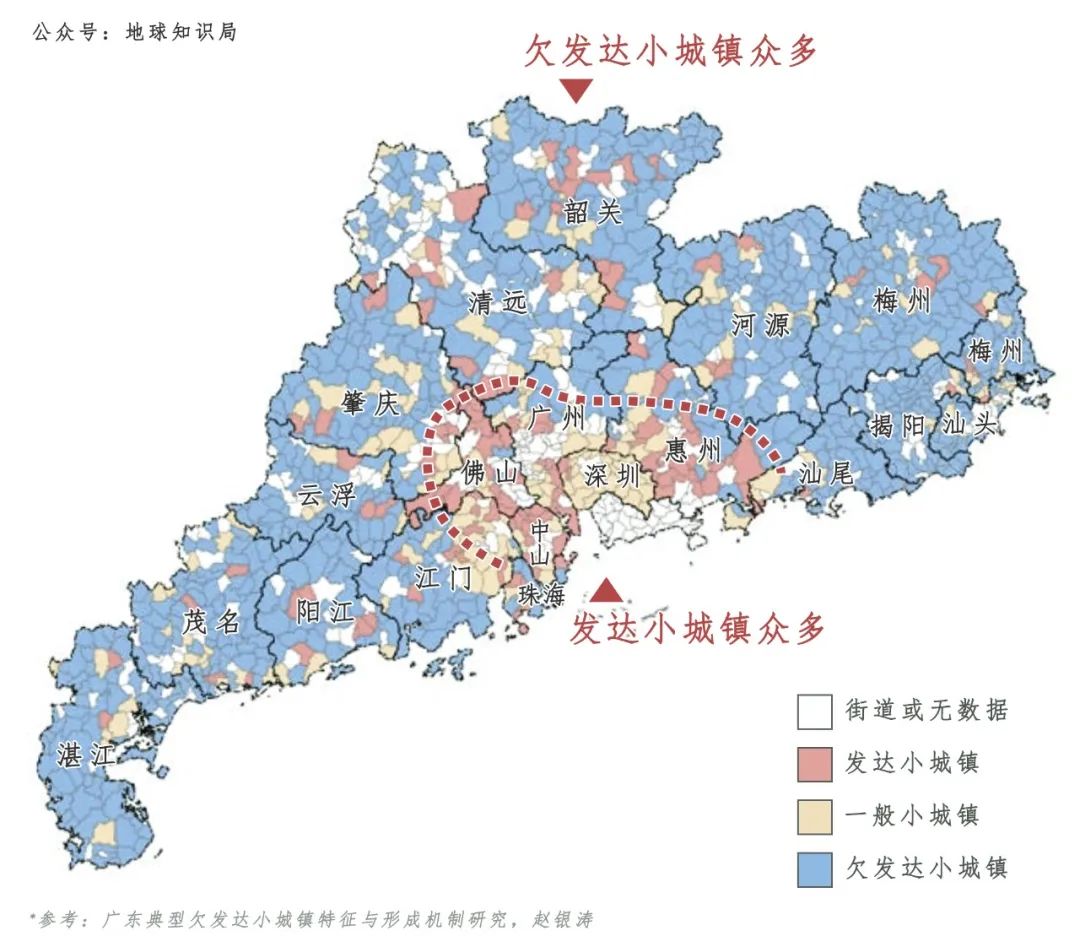 在粵東、西、北三個地區共有796個小城鎮,多達647個為欠發達城鎮,佔到80%多。反觀珠三角地區納入統計的小鎮共有321個,其中139個為欠發達城鎮,一半不到。即使是這些珠三角的欠發達小鎮,也大多分佈在肇慶西部、清遠北部、惠州東部,仍然屬於廣義上的粵東、北、西山區。