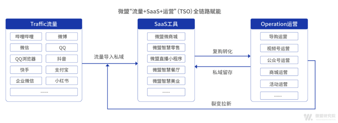 **該部的增長動因中,TSO全鏈路營銷亦是不容忽視的一環。**2020年,微盟提出了“TSO全鏈路智慧增長解決方案”,T代表Traffic(流量),S代表SaaS(工具),O代表Operation(運營)。