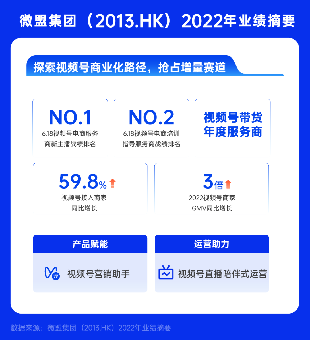 可以看到,2022年,微盟推出“視頻號營銷助手”解決方案,同時橫向打通微盟已有的企微助手、OneCRM、CDP+MA等產品,提升以“視頻號”為載體的全鏈路營銷服務能力,為各行業商家品牌打通從公域直播賣貨到私域用户運營增長的營銷閉環。
