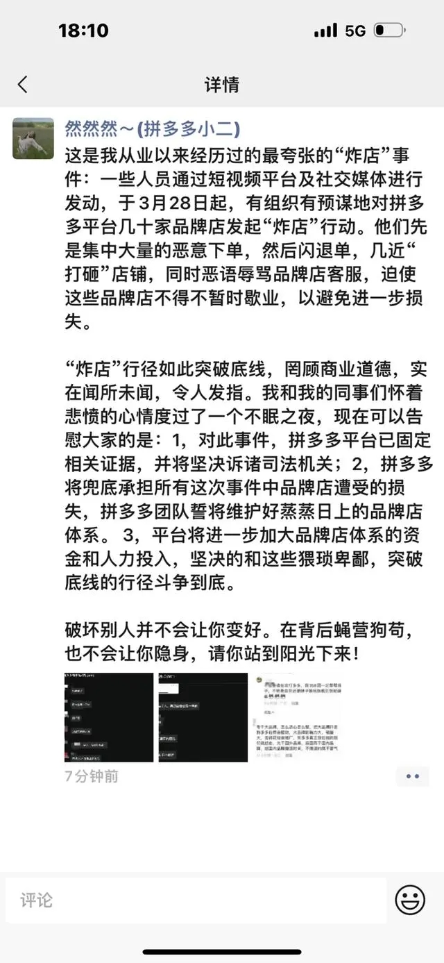 拼多多小二怒斥“炸店”行徑,稱將堅決訴諸司法