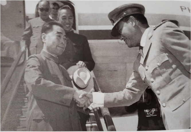 • 1964年2月,周恩來總理訪問緬甸,與前往迎接的緬甸聯邦革命委員會主席吳奈温(右)在飛機舷梯前握手。