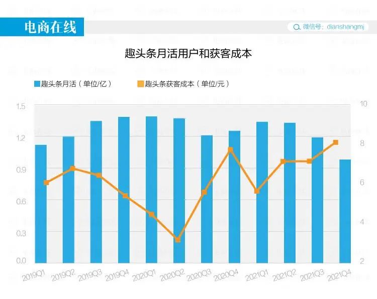 到了2019年第三季度,趣頭條的月活增長放緩,隨後幾乎停止增長,而新增用户成本不斷上升。趣頭條最新公佈的2021年第四季度財報顯示,趣頭條的獲客成本已經達到了8.26元,下沉市場的流量正在越來越貴。