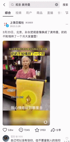 不過,這則視頻經歷瞭如此大量的轉發、翻錄、二次創作,並且被這麼多人翻來覆去,在孝道問題上討論,在信仰問題上討論,在奧特曼整活意義上抖機靈,似乎就擁有了其新的“價值”。