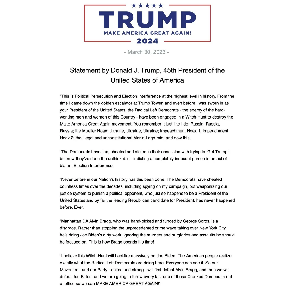特朗普強硬回應被起訴:我們將擊敗拜登,將狡詐的民主黨人趕出辦公室~_風聞