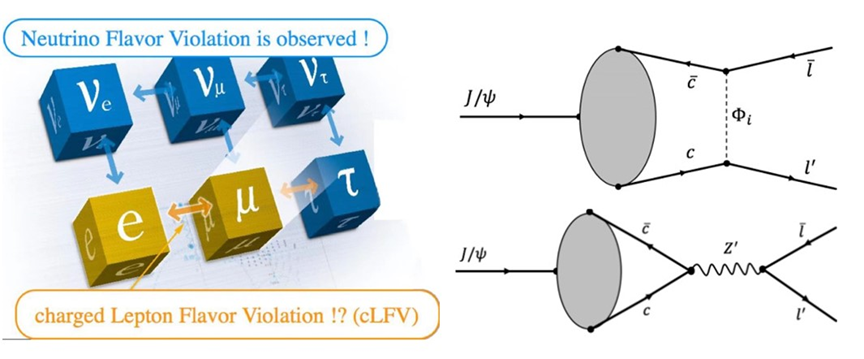 右邊的費曼圖是可能的理論解釋,上面是ccbar中間通過交換一個超對稱傳播子,變成了右邊的兩個不同味道的輕子。下面是兩個是同味的夸克通過另外一個傳播子變成不同味道的輕子。這些在目前的理論裏是可能允許的,但是這個比率非常小,遠比我們設計的小。