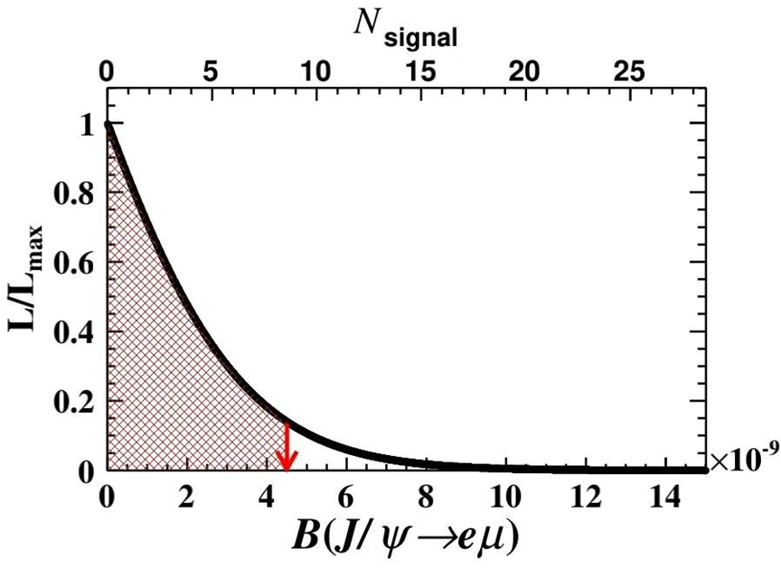 **劉倩:**這個圖橫軸是e和μ的不變質量譜,表示e和μ是從質量為多少的質心繫中衰變出來的,你可以看到它的峯值在3.1GeV左右,3.1GeV就是我們丁肇中先生髮現的J/ψ粒子的質量,就是粲夸克偶素ccbar。右邊這一系列是我們編的一個實驗數據,表示到底有多少個J/ψ,和有多少個J/ψ衰變到了eμ,然後算它的分支比是多少。這個地方的5.9%其實是J/ψ→e+e-或μ+μ-的分支比,我們就特意寫了5.9%,所以每個數也是有一個來歷的。