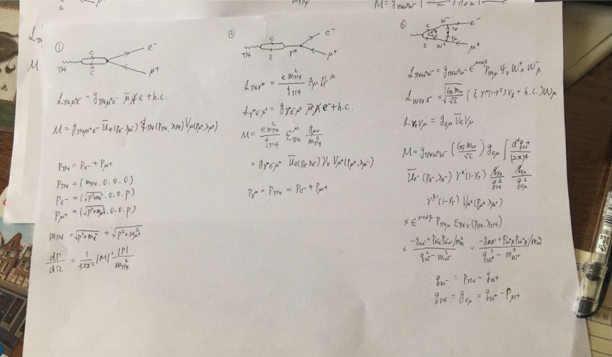 **吳佳俊:**這個費曼圖的手稿是我設計的。剛才説到,楊冬的實驗説明J/ψ→eμ的反應有很大的產率,所以丁儀就去思考為什麼會有這麼大的產率,這三個費曼圖就是可能的三種解釋。這裏值得説一下,費曼是很偉大的物理學家,他設計了一套精美的圖示幫助我們理解相互作用的物理圖像,同時還極大地簡化了計算過程,電視劇裏曼費教授的名字其實就取自於費曼。