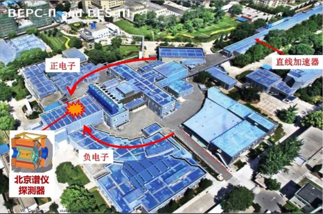 **呂曉睿:**BEPC在長安街玉泉路地鐵邊上,中國科學院高能研究所裏邊。直線加速器把正電子和負電子,分別加速到一個很高的能量,速度接近光速,然後分別送到紅色箭頭標誌的環,它們在這個環裏會被精密的磁鐵系統束縛成一個非常完美的環形。最後到了圖裏畫着星星的地方,發生正負電子對撞,湮滅成能量,而能量會轉化為新的物質,進而被北京譜儀探測器所探測。