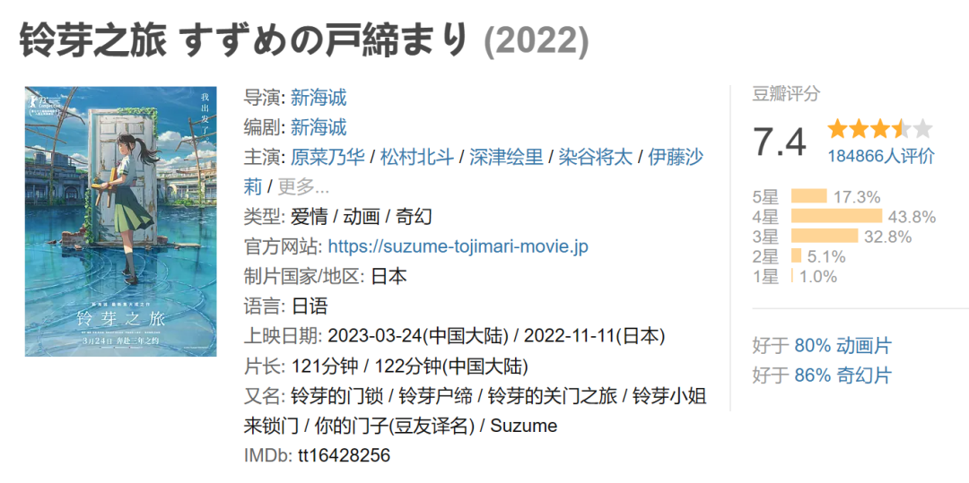 然而,對於站在核心消費羣體之外的觀影人羣來説,這些隱晦表達反而成了觀影門檻。直觀的表現是,隨着影片票房持續走高,《鈴芽之旅》的豆瓣評分從7.8分下降至7.4分,圍繞影片的爭議也迅速擴大。