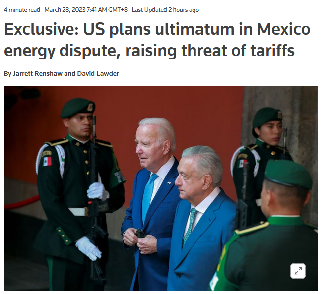 據路透社3月27報道,為打破美墨圍繞能源貿易爭端的僵局,拜登政府計劃在未來數週內向墨西哥發出“最後通牒”,要求對方“立刻採取行動”調整能源政策,否則將成立一個爭端解決小組,最終可能對其加徵數十億美元的報復性關税。美國政府去年7月曾恐高墨西哥政府推行的能源改革政策偏袒本國國有企業,這嚴重的損害了美企的利益。很顯然,墨西哥自己也有油,人家想用自己的油,結果美國不幹,非得讓墨西哥買自己的油。大家説説,這講理嗎?這不是強盜嗎?墨西哥自己有油不能用,拜登非讓用他的,如果墨西哥不答應,美國就準備以罰款的名義強搶墨西哥幾十億美元。