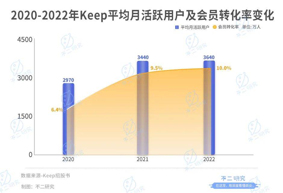 據新版招股書顯示,2022年,Keep的平均月活躍用户為3640萬人,同比增長僅6%,其中去年二季度平均月度活躍用户達到4108萬人。同期,其會員存留率為65.3%。平台上月活躍用户會員的轉化率由2020年的6.4%增加到2021年的9.5%,並繼續增加到2022年的10%。