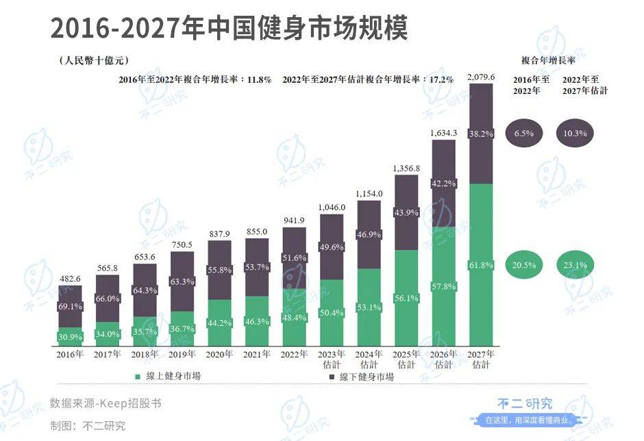 根據灼識諮詢報告,按經銷渠道劃分中國健身市場2016年達4.83千億元,2022年增至9.42千億元,複合年增長率11.8%,預計2027年將以17.2%的年複合增長率增至20.77千億元。其中,2022年中國線上健身市場佔中國整體健身市場的48.4%,預計2027年將佔61.8%。
