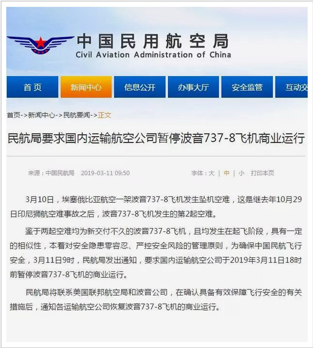 2019年3月10日,波音737MAX8機型在四個多月內發生第二起墜毀事故。第二天,中國民航局首先發布了737MAX8停飛指令。