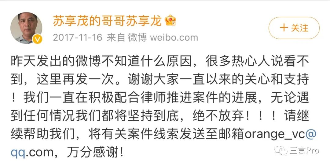 2017年11月16日,蘇享茂自殺兩個多月後,其哥哥發佈第一條微博,表示自己和家人無論遇到任何情況都將堅持到底,絕不放棄。還公佈了郵箱徵集線索。