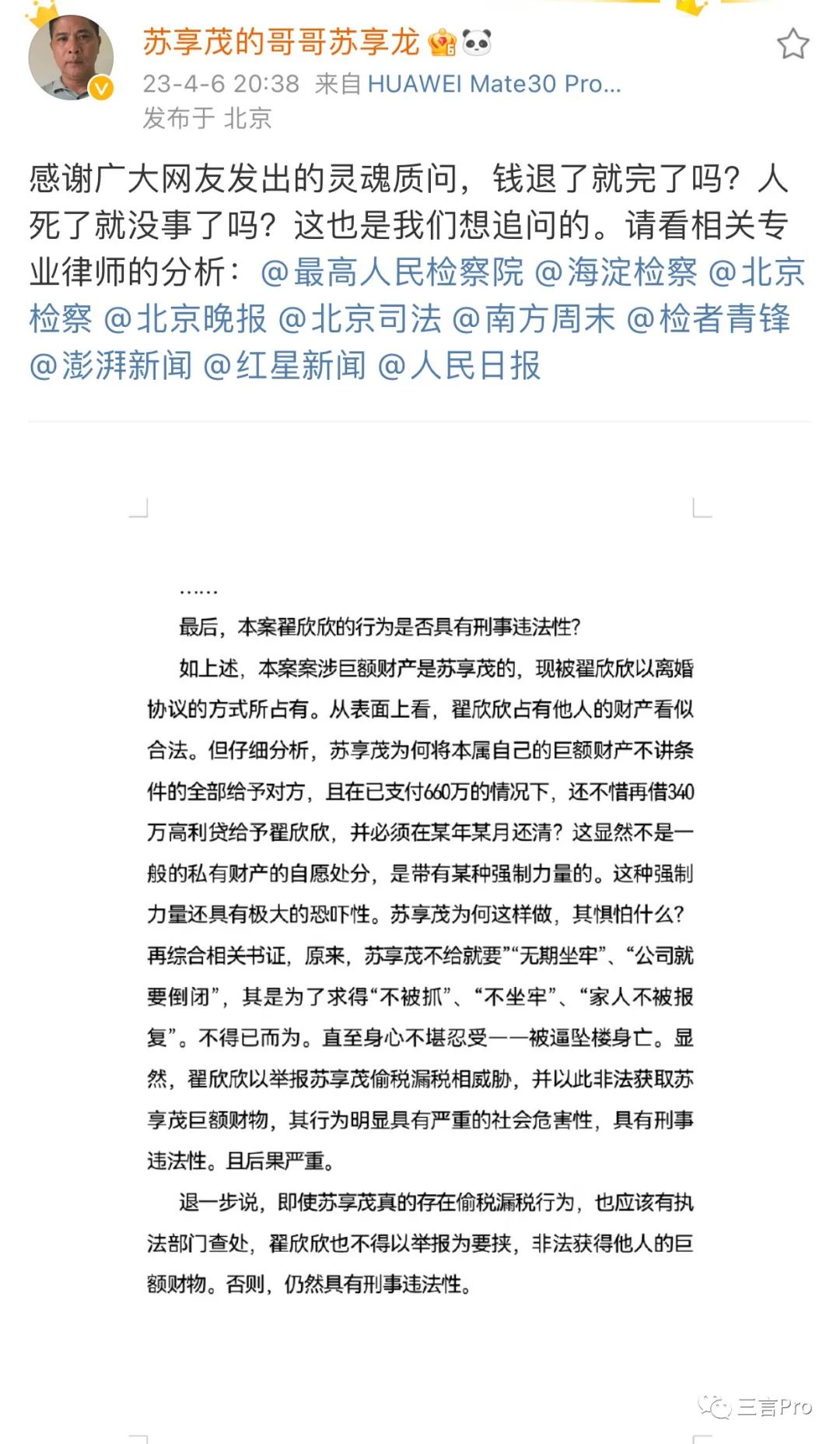 蘇享龍還曾在微博上髮長文正告翟欣欣以及其家人、律師,要求對方退還財物,並向蘇家道歉。