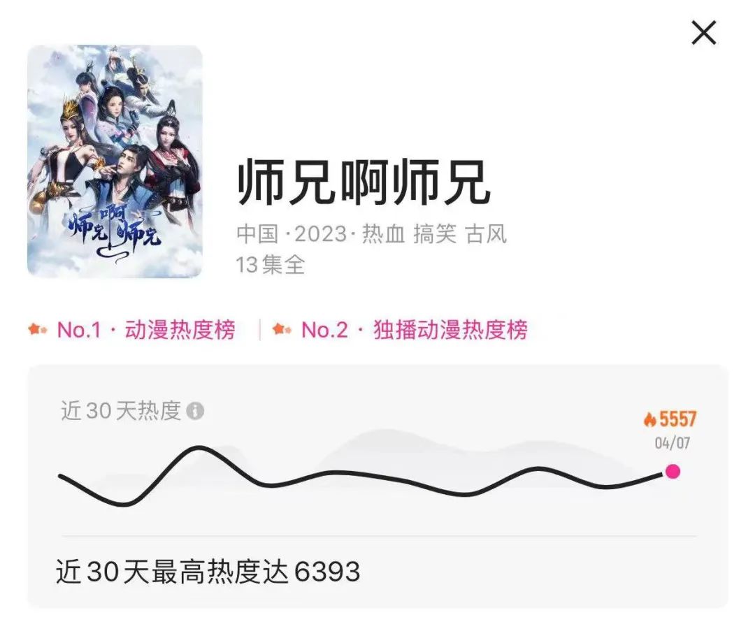 《師兄啊師兄》就這樣成為今春國漫的最大一匹黑馬。在優酷站內,橫掃人氣、新番、男生、國創四大榜單。在短視頻,《師兄啊師兄》相關話題累計播放量達43億+,領跑春節檔所有在播動畫項目。而隨着4月6日《師兄啊師兄》收官,黑馬頻出的優酷動漫還將如何攪動市場,更值得我們關注。
