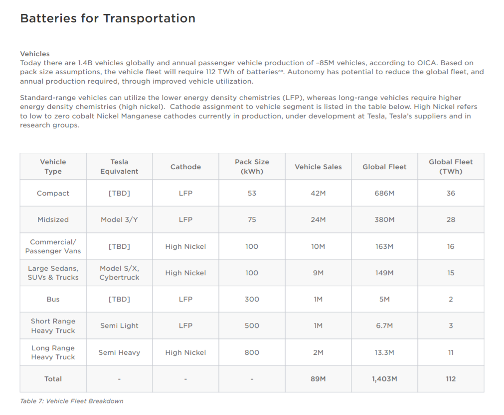 值得注意的是,文件中提到,特斯拉在研的緊湊型電動汽車計劃配備53kWh的磷酸鐵鋰電池,目標銷量為4200萬輛——這一目標銷量幾乎是Model 3/Y的兩倍,這兩款中型汽車計劃配備75kWh的磷酸鐵鋰電池,目標銷量2400萬輛。Model S/X及Cybertruck等車型計劃配備100kWh高鎳電池,目標銷量為900萬輛;另外,短途重卡、長續航重卡計劃分別配備500kWh、800kWh高鎳電池,目標銷量合計300萬輛。目前特斯拉規劃的所有車型總目標銷量為8900萬輛。