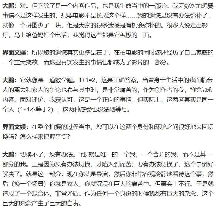 一如大鵬在接受採訪時,也明確表達過拍攝時,和後來4年間後期修改期間,在身為感性的親人,身為理性導演之間的來回切換的痛苦、內疚的複雜情緒。