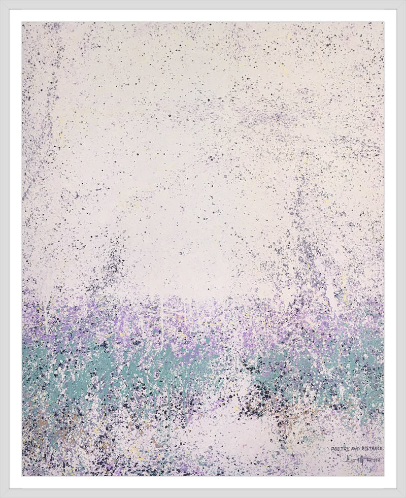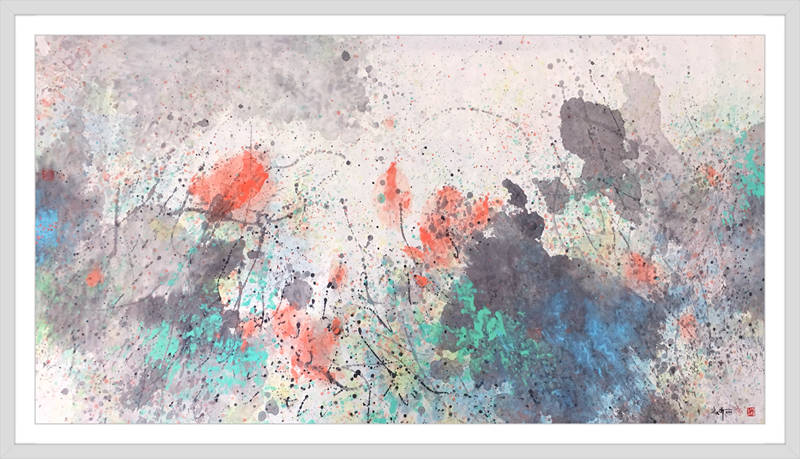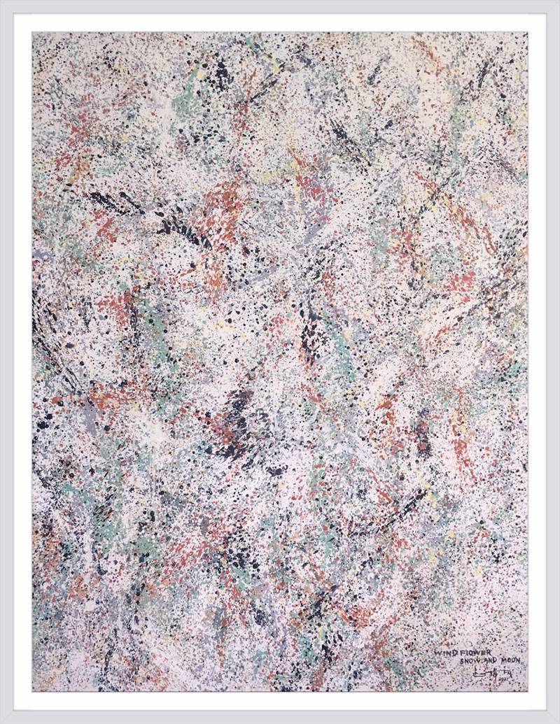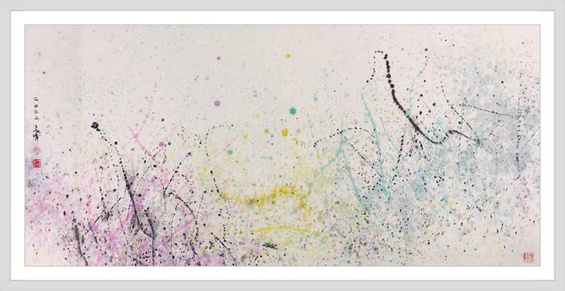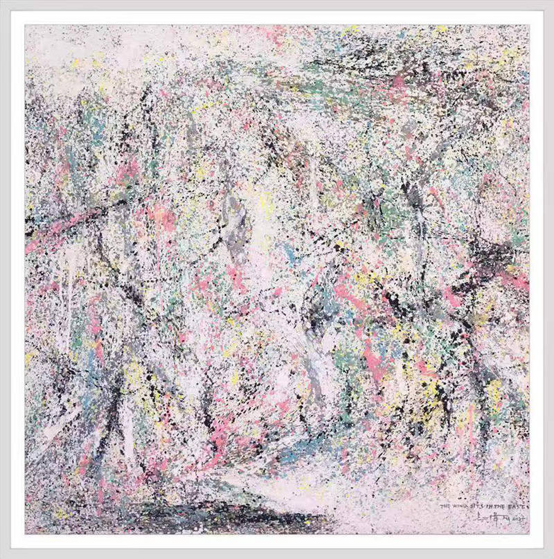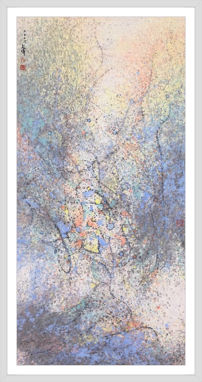 灑成的色彩微點,通過疏密佈置,高低相盈,前後相隨,有無相生等等豐富多元的結構組織,為審美帶來無窮無盡的哲學思維通道。站在這個角度講,傅志偉的灑彩作品是構建在中國傳統文化體系內的抽象創作結果,印象派的色彩,中國畫的意境,是詩意化了的抽象美術創作結果。精微細膩,惟妙惟肖。這與波洛克的滴彩創作,可以視之為當代抽象創作來自東方和西方的和壁與隋珠,他們共同拱鼎起現代抽象美術的世界天空!